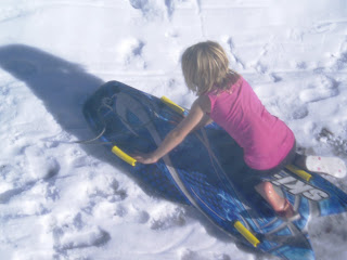 Watching my daughter surf the snow, from our dining room window (hence, the haze). Notice her bare foot. It was in the 70s this day, just after the Halloween blizzard .